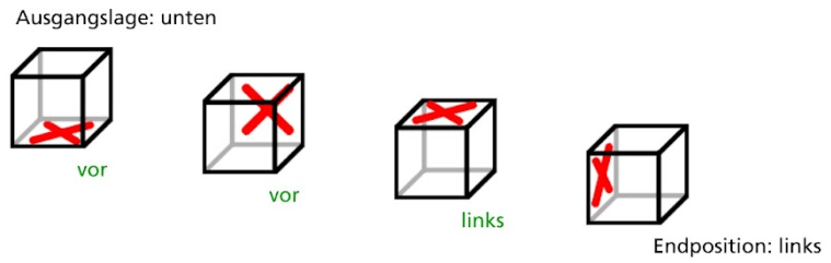 Beachten Sie, dass der Würfel immer nur über eine Kante gekippt, niemals um die vertikale Achse gedreht wird! Am Ende jeder Aufgabe sollen Sie angeben, in welcher von sechs möglichen Endpositionen sich das Kreuz befindet (links, rechts, oben, unten, vorn, hinten). Sowohl Anzahl als auch Geschwindigkeit der Kippanweisungen werden sich im Laufe des Trainings steigern.